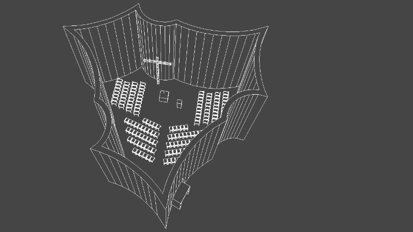 Die lokale Präsenz der Kiche als Institution im "sozialen Brennpunkt" Eckersbach wird durch die expressive Baukörperkonfiguration bildhaft dargestellt; das Gemeindezentrum gibt sich durch sein Erscheinungsbild als neue Mitte der Gemeinde zu erkennen. Die aufstrebenden, konkav - konvex geformten Wände des Kirchenraumes bilden einen Ort der Kontemplation. Die gestalteten Glasflächen des geneigten Daches lassen das Licht diffus in den Innenraum dringen. Die Intensität des Lichteinfalles wird durch unterschiedlich dicht gewebte Metallgewebe gesteuert. Durch diese Konzeption wird durch die Ordnung des Raumes seine Bestimmung ausgedrückt. Eine Bewegung aus zwei Richtungen, wird baulich dargestellt - einerseits das herabfallende Licht als Bild der Hoffnung, andererseits die aufstrebenden Bauglieder als Bild der Gebete. Zahl, Maß und Proportion der gesamten Anlage leiten sich aus der figürlichen Darstellung des "vollkommenen Dreiecks" (Tetraktys) und den in der PYTHAGORÄISCHEN Tradition bevorzugten Zahlen ab. Die Schaffung eines überzeugenden Sakralraumes, der die Gläubigen zu einer Gemeinschaft zusammenschließt war erklärtes Ziel der Planung. Es ist ein festlicher Raum mit menschlichem Maßstab, der auch bei vorrübergehender anderer Nutzung (z.B.Gemeindefest) seine ihm zugedachte Funktion nicht verleugnet. Die drei klar abgegrenzten Organisationsbereiche; - Pfarrerwohnung, Gemeindezentrum und Jugendbereich sind unter dem, in zwei Richtungen geneigten Dach als Einheit zusammengefaßt und korrespondieren in vielfältiger Weise mit ihrer Umgebung. Auf einen Turm für die Läuteanlage soll aus Kostengründen verzichtet werden. Die Glocken sollen an einer der Kirchenwände befestigt werden. Die Orientierung sämtlicher Bereiche zum Kirchhof unterstützt dabei den Gedanken, einen gemeinsamen Ort (Platz) als Treffpunkt für alle anbieten zu wollen. Dieser Bereich sollte offen und einladend gestaltet werden um die sonst evt. auftretenden Schwellenängste im Vorfeld zu nehmen. Durch die klare Geometrie des Platzes wird der Kirche ein Bereich im städtebaulichen Kontext zugewiesen (Temenos - heiliger Bezirk).