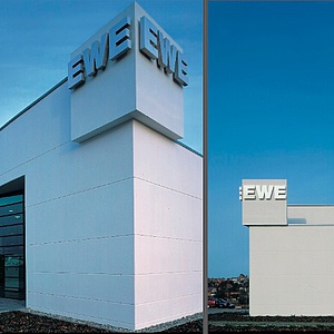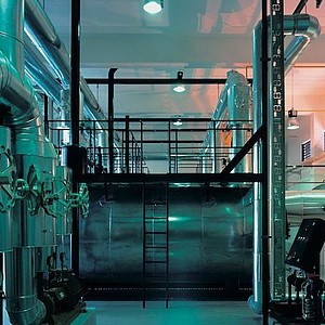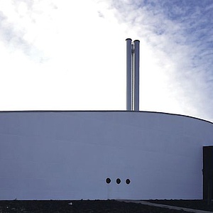 Das Energieversorgungsunternehmen EWE Oldenburg war mit der Aufgabe betraut, die zum Naturschutzgebiet erklärte Insel Rügen von Braunkohle auf den umweltfreundlicheren Energieträger Erdgas umzustellen. Beim Heizhaus in Bergen wurden die Wandflächen als einschalige, ungedämmte Sichtbetonkonstruktion, mit horizontaler Scheinfugenausbildung ausgeführt. Die Stahl - Glasfassade, die thematisch als Schaufenster aufgefaßt wird, ist als Pfosten -Riegelkonstruktion ausgebildet. Die Gesamtleistung der Anlage wird von drei gasbetriebenen und mit Abgasschalldämpfern versehenen Hochdruckheizwasserkesseln mit je 4.8 MW Einzelleistung erzeugt. Abschluß der technischen Anlage ist ein Dreifachschornstein aus Stahl mit einer Gesamthöhe von 24m.