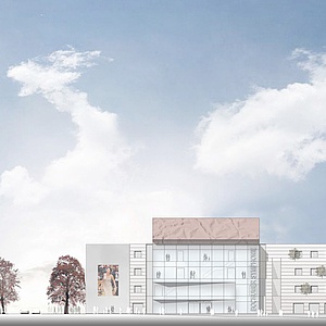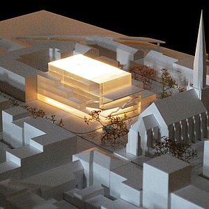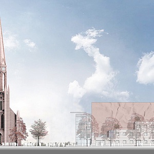 Die Wand des Konzertsaals, mit seiner Oberflächengestaltung wird zum identitätsstiftenden Merkmal der Fassaden; die übrigen Funktionsbereiche, treten als eigenständige, abgetreppte Kubatur in Erscheinung. Diese dient als Rückgrad und stärkt durch bewusst niedrige Baukörperhöhe die Außenwirkung des Saales; durch die Terassenförmige Ausbildung des Bauvolumens wird die Bedeutung der Marienkirche innerhalb des Gesamtensembles gestärkt und ein lichtdurchfluteter Platz mit einladendem Charakter gebildet.