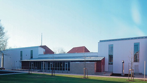 Fortbildungseinrichtung der Berufsfeuerwehr in Nordrhein-Westfalen (Wettbewerb 1.Preis). Komplex für Verwaltung, Schulung, Freizeit und Wohnen um einen ca. 50 x 100 Meter großen parkähnlichen Innenhof. Der Entwurf ist angelehnt an für das Münsterland typische traditionelle Bauweise: rote Backsteine und Betonung der äußeren Fensterlaibungen.