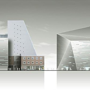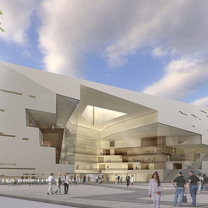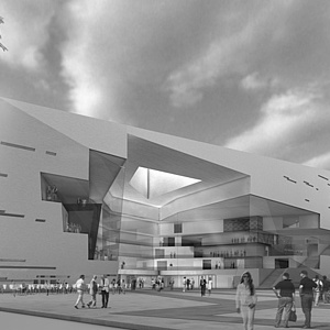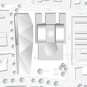 NEUE BÜHNEN KÖLN • Die Kontur des neuen Schauspielhauses wird – ähnlich wie beim Facettenschliff des Brillanten – in das Stadtgefüge eingepasst. Es kommt jedoch keine regelmäßige Schliffform zur Anwendung; diese wird aus den Grenzen und Höhen der umgebenden Bebauung, sowie den historisch überlieferten Baufluchten, sowie den Bezügen zum dernkmalgeschützten Opernhaus aus dem Jahre 1957, sowie den vorhandenen Sichtachsen entwickelt; die Grundstruktur wird aus der Komposition des aufgrund seiner Funktion geschlossenen Bühnenbereiches und den umgebenden Funktions- und Erschließungsbereichen gebildet.
