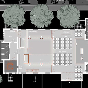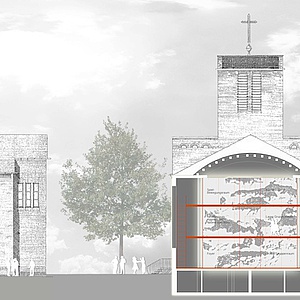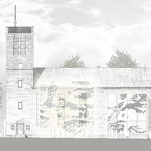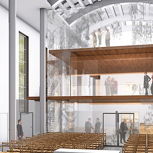 UMBAU - UMNUTZUNG ZIONSKIRCHE HERNE • Die benötigten Räume des Gemeindezentrums werden in einem eingestellten, gläsernen Kubus mit einer Kantenlänge von 9 Metern, sowie dem über Galerien angebundenen Turmbereich untergebracht, wobei bewusst Abstand vom Bestand gehalten wird, um den Raumeindruck möglichst zu erhalten. Wechselseitige Einsichtigkeit zwischen der so entstehenden neuen "Gottesdienstzone" und den Gemeinderäumen ist gewollt.